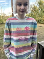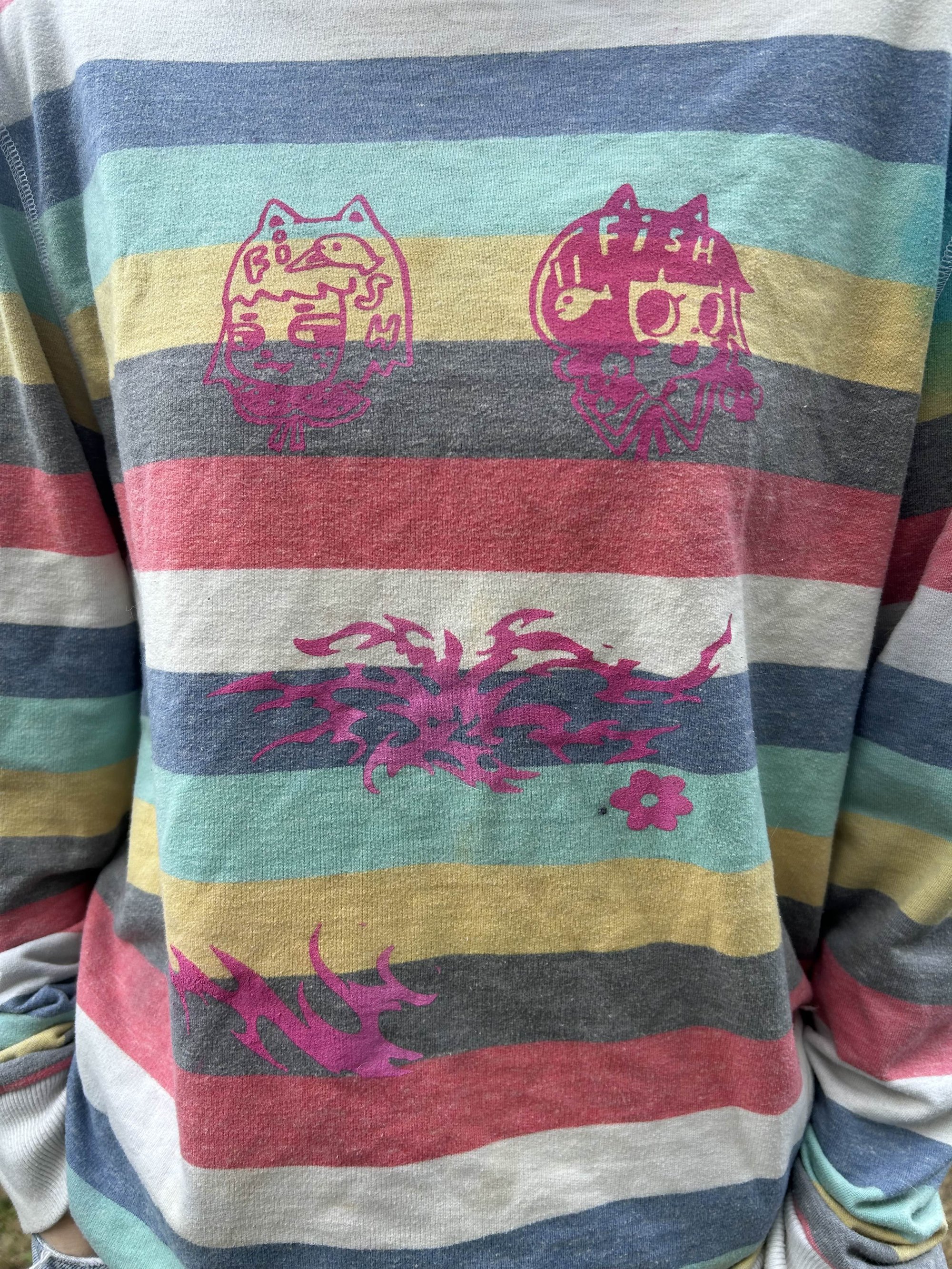 this shirt is so well loved. it was one from high school lol so its old... and there is a big ink stain on the left sleeve. but the colors are so cute! price reflects the nature of the shirt.